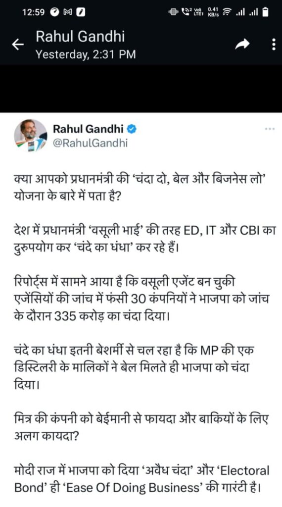 वहीं कांग्रेस नेता ने कहा कि क्या आपको प्रधानमंत्री की ‘चंदा दो, बेल और बिजनेस लो’ योजना के बारे में पता है? देश में प्रधानमंत्री ‘वसूली भाई’ की तरह ED,IT और CBI का दुरुपयोग कर ‘चंदे का धंधा’ कर रहे हैं। रिपोर्ट्स में सामने आया है कि वसूली एजेंट बन चुकी एजेंसियों की जांच में फंसी 30 कंपनियों ने बीजेपी को जांच के दौरान 335 करोड़ का चंदा दिया। चंदे का धंधा इतनी बेशर्मी से चल रहा है कि MP की एक डिस्टिलरी के मालिकों ने बेल मिलते ही बीजेपी को चंदा दिया। मित्र की कंपनी को बेईमानी से फायदा और बाकियों के लिए अलग कायदा? मोदी राज में बीजेपी को दिया ‘अवैध चंदा’ और ‘Electrol bond ’ ही ‘Ease to Doing Business’ की गारंटी है।