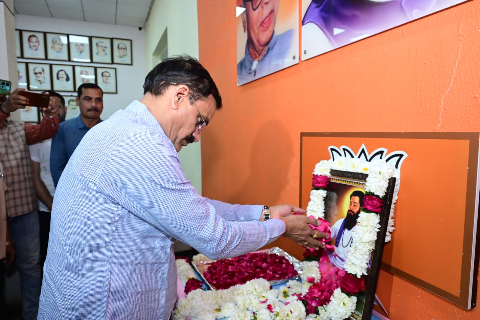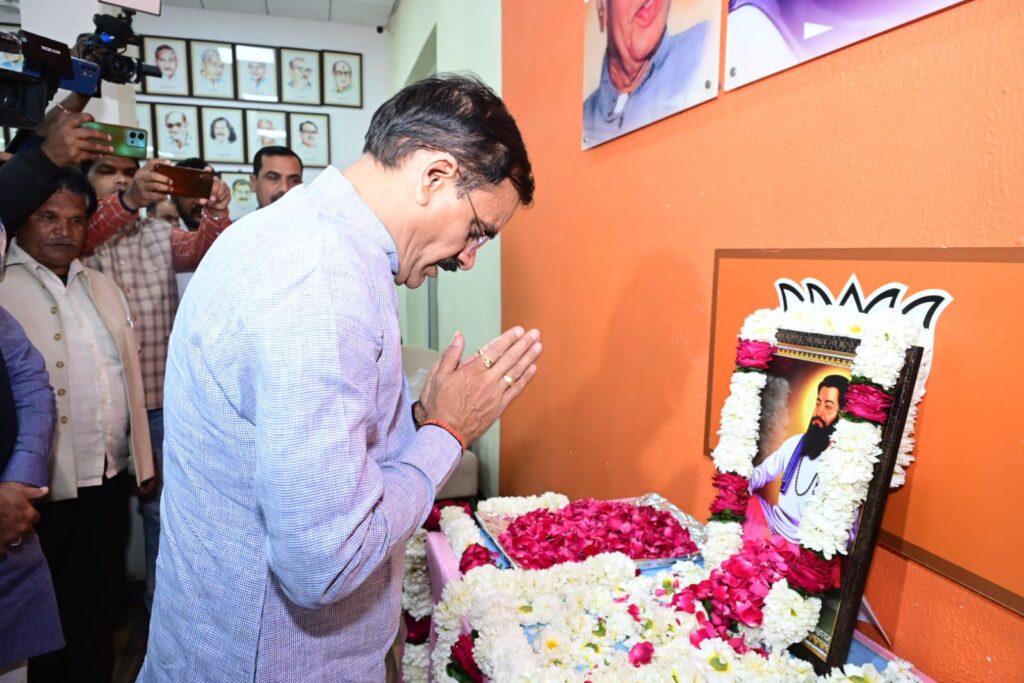 भोपाल:- भारतीय जनता पार्टी के प्रदेश अध्यक्ष व सांसद श्री विष्णुदत्त शर्मा ने शनिवार को प्रदेश कार्यालय में संत रविदास जी की जयंती पर उनके चित्र पर माल्यार्पण कर नमन किया। इस अवसर पर मध्यप्रदेश शासन के मंत्री श्री नरेंद्र शिवाजी पटेल, प्रदेश महामंत्री व विधायक श्री भगवानदास सबनानी एवं पूर्व सांसद श्री आलोक संजर सहित पदाधिकारी एवं कार्यकर्ताओं ने पुष्पांजलि अर्पित की।